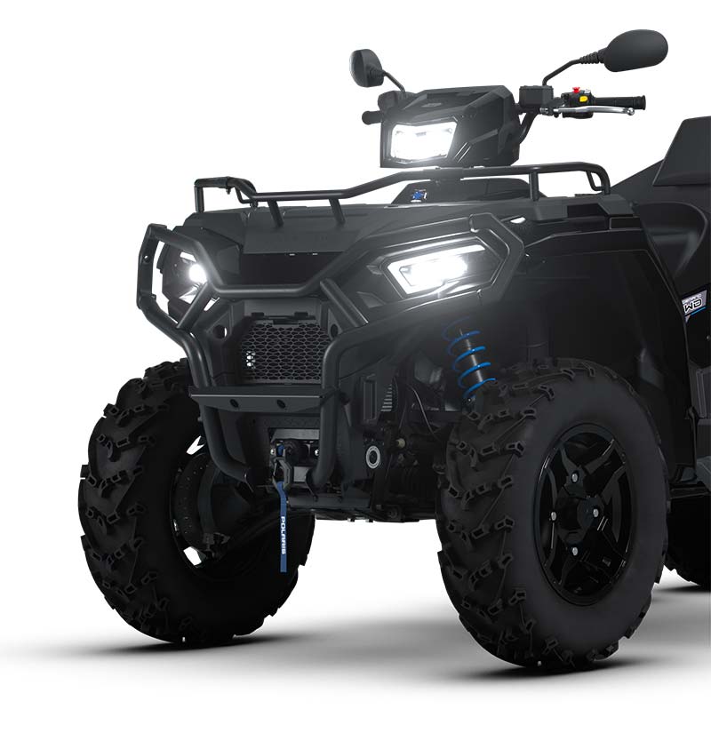 - 3 modos de condução: Standard / work / performance. Tomada de 12 V, porta de carregamento lento no painel, aquecedores de mãos e polegares incluídos, sistema de segurança ativado por PIN (P.A.S.S.). Guincho de 3500 lb com corda sintética e NOVO Auto Stop. Proteções dos braços em A dianteiros e traseiros, para-choques dianteiro trail, extensor de rack dianteiro, grades metálicas da caixa de carga, plásticos pintados, protetores de mãos.