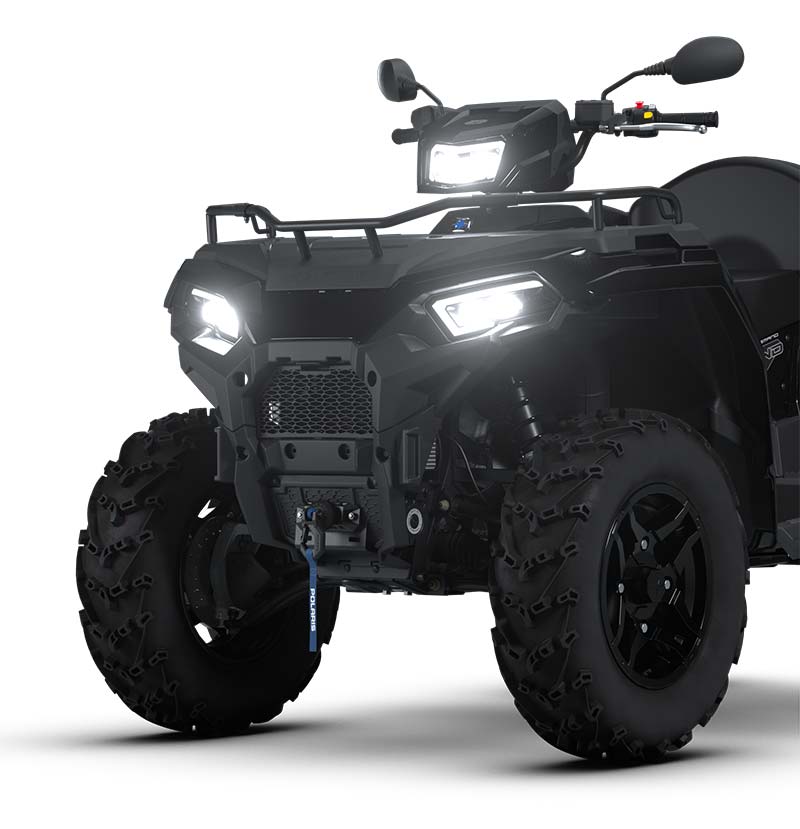 - 3 modos de condução: Standard / work / performance. Tomada de 12 V, porta de carregamento lento no painel, aquecedores de mãos e polegares incluídos, aquecedor de motor DEFA, sistema de segurança ativado por PIN (P.A.S.S.). Guincho de 3500 lb com corda sintética e NOVO Auto Stop. Extensor de rack dianteiro, caixa de carga, proteções dos braços em A dianteiros e traseiros, plásticos pintados.